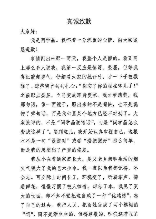 在舆论压力和事业损失的双重夹击下,1月11号晚上,闫学晶终于在朋友圈发长文道歉了。这次的道歉信没有回避问题,核心内容有3个。 一是认了错。直言自己不是“嘴快说错话”,而是“思想出了严重偏差”,成名后被掌声鲜花包围,渐渐忘了自己农村出身的根本,对老百姓的敬畏心没了; 二是深刻剖析自己。说以前把“人民”“百姓”当成模糊的符号,而不是活生生的人,还坦言“讨厌那个下意识里露出轻视的自己”,称这次事件是“给灵魂动了一次手术”。 三是承诺以后要沉下来,多去体验普通百姓的生活昆明配资最新消息,重新找回对生活的感知,把“老百姓”当成做人从艺的根本。