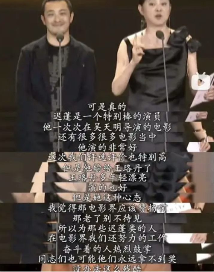 “同样的演技,年轻、长得漂亮就大受欢迎。今天所有人都穿着礼服,最佳女配奖提名人迟蓬,她穿一件破毛衣在那儿,还穿着胶鞋。她演得非常好,我们评价也特别高,但是她输给王珞丹了。王珞丹年轻漂亮,演得也好,但她(迟蓬)这种心态应该赞扬。”